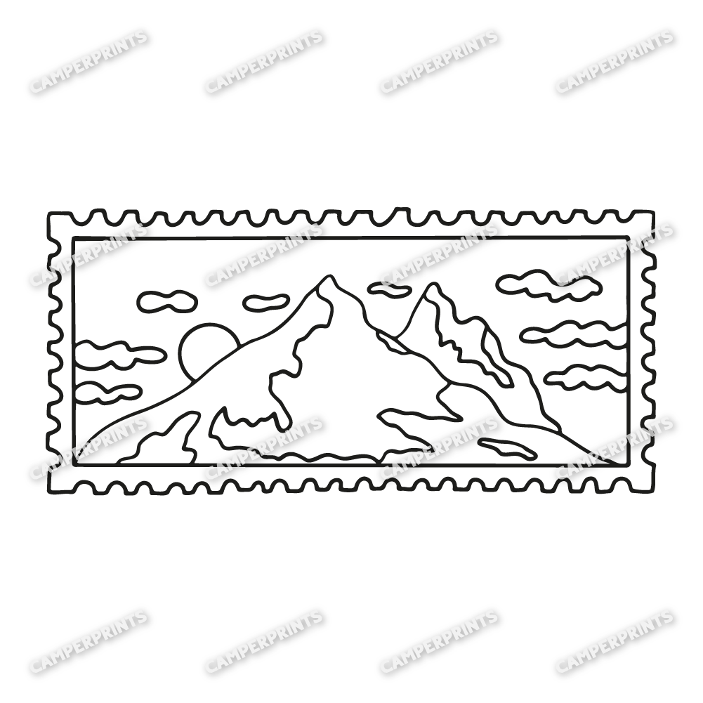 Briefmarken Aufkleber Berge Sonne Wolken, feiner Linien-Camper-Aufkleber im Briefmarkenstil mit Bergpanorama.