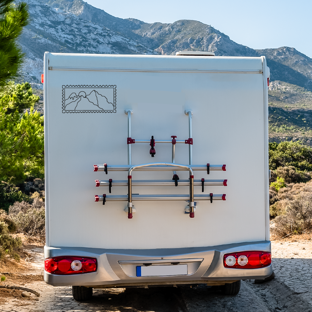Post stamp sticker mountains and sun, minimalist camper decal with mountain panorama and sun in a stamp-style design.
