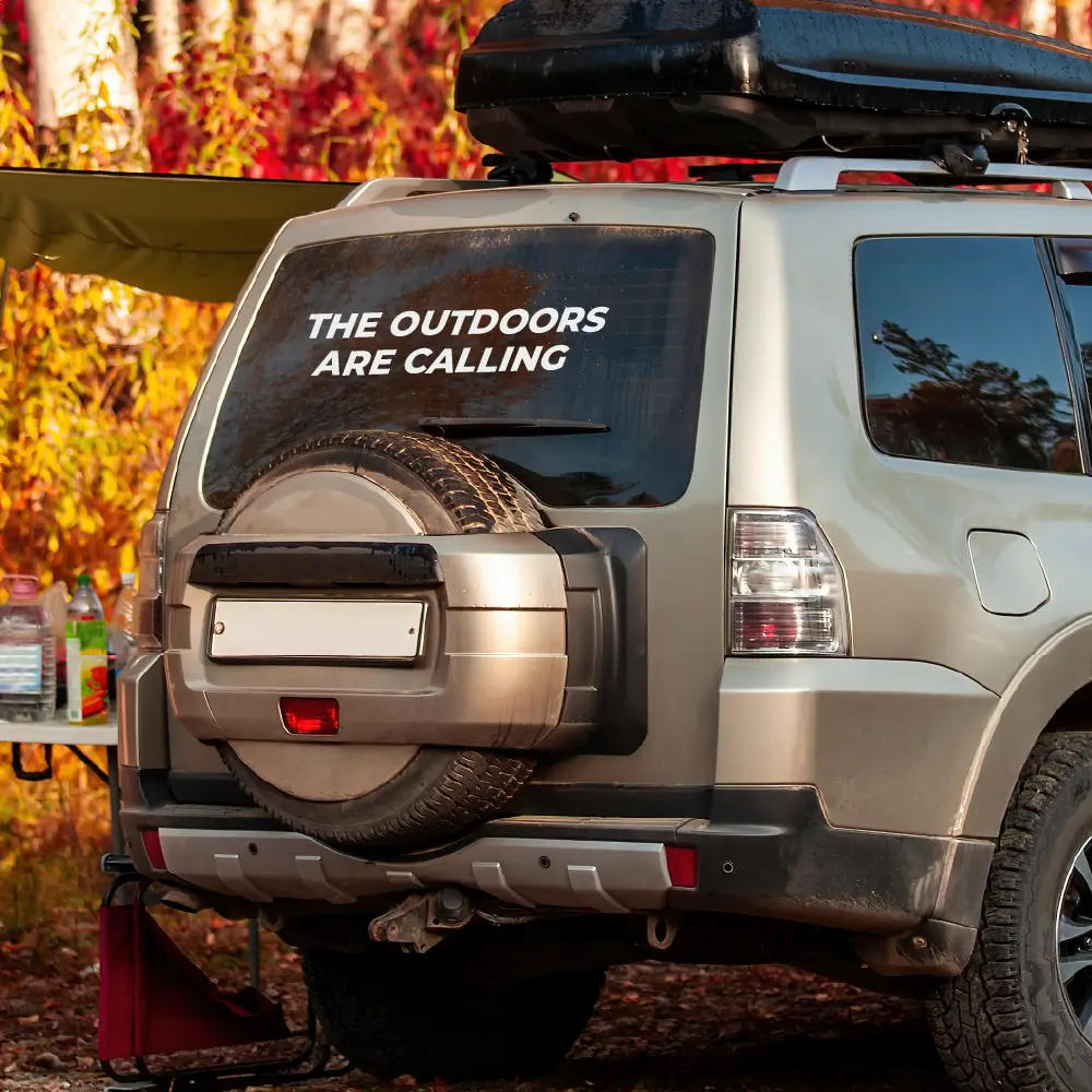 Kleef The outdoors are calling sticker op je reisvoertuig en iedereen weet meteen wat je gaat doen. Heerlijk de bossen in of boven op de berg aan het genieten. Love the nature and then nature loves you!